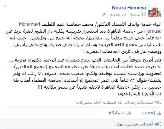 قالت ابنة الدكتور محمد حماسة عبد اللطيف، أستاذ النحو ووكيل كلية دار العلوم الأسبق ونائب رئيس مجمع اللغة العربية، إن “إنهاء خدمة والدي من جامعة القاهرة بعد استمرار تدريسه بكلية دار العلوم لفترة تزيد على ٥٠ عاماً حتى أصبح مَعلَماً من معالمها، بحجة أنه جمع بين وظيفتين -حيث إنه نائب لرئيس مجمع اللغة العربية- وسام شرف على صدري وتاج على رأسي ووصمة عار في تاريخ الجامعات المصرية”.