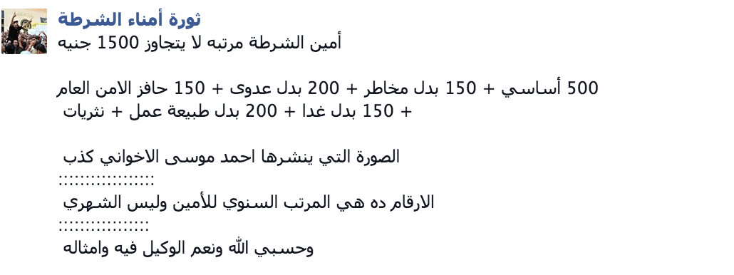وكذبت الصفحة ما قاله موسي بأن راتب أمين الشرطة في مصر يتراوح ما بين 4992 إلى 7880 جنيهًا، قائلة: “أمين الشرطة راتبه لا يتجاوز 1500 جنيه”.