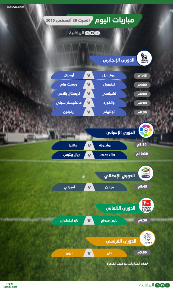 تُجرى اليوم السبت عدة مباريات مختلفة في بطولات أوروبية وعالمية، بالدوري الإنجليزي والفرنسي والإسباني والإيطالي، إليكم المباريات بمواعيدها في سياق الجدول التالي: