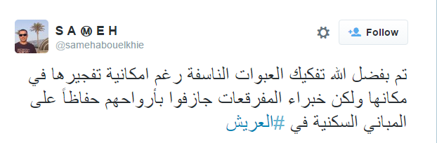 وعلق سامح قائلًا: “تم بفضل الله تفكيك العبوات الناسفة رغم إمكانية تفجيرها في مكانها، ولكن خبراء المفرقعات جازفوا بأرواحهم حفاظًا على المباني السكنية في العريش”.