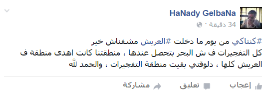 وقالت HaNady GelbaNa: “كنتاكي من يوم ما دخلت العريش مشفناش خير، كل التفجيرات في شارع البحر بتحصل عندها، منطقتنا كانت أهدى منطقة في العريش كلها، دلوقتي بقيت منطقة التفجيرات، والحمد لله”.