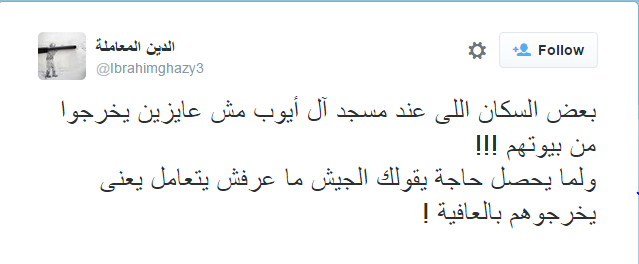 فيما قال Ibrahimghazy3: “بعض السكان اللي عند مسجد آل أيوب مش عايزين يخرجوا من بيوتهم!!!، ولما يحصل حاجة يقولك الجيش ما عرفش يتعامل يعنى يخرجوهم بالعافية!”.