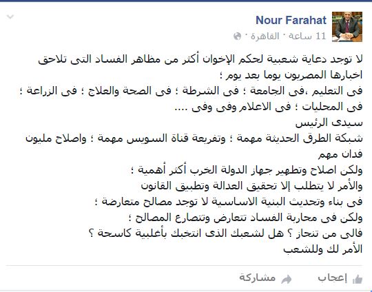 وقال -عبر منشور له على “فيس بوك”- “لا توجد دعاية شعبية لحكم الإخوان أكثر من مظاهر الفساد التي تلاحق أخبارها المصريون يومًا بعد يوم، في التعليم، في الجامعة، في الشرطة، في الصحة والعلاج، في الزراعة، في المحليات، في الاعلام وفي وفي..”.