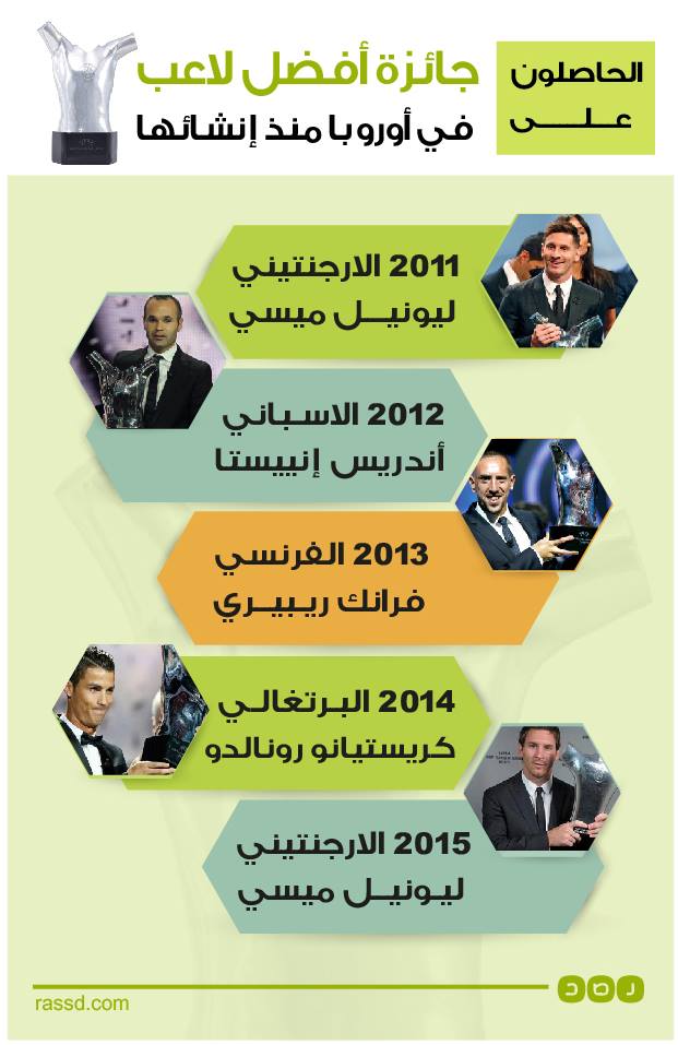 بعد حصول الأرجنتيني ليونيل ميسي لاعب نادي برشلونة الإسباني على جائزة أفضل لاعب في أوروبا لعام 2015، تستعرض معكم شبكة “رصد” توضيحًا بالإنفوجرافيك للحاصلين على الجائزة منذ عام 2011.