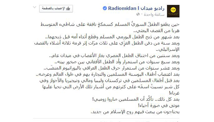 وأضافت الصفحة: “وبعد اغتصاب أطفال البوسنة المسلمين والتجارة بهم في طول العالم وعرضه.. بعد قتل أطفال المسلمين في تركستان وليبيا ومالي ونيجيريا والأحواز وفي كل شبر نسيتُ اسمَه على كثرتهم من أشبار تلك الأرض التي نحيا عليها غرباء! بعد كل ذلك.. تأكَّد أن المسلمين صاروا زومبيا! موتى في صورة أحياء، يحتاجون من يبعث فيهم روح الإسلام من جديد”.