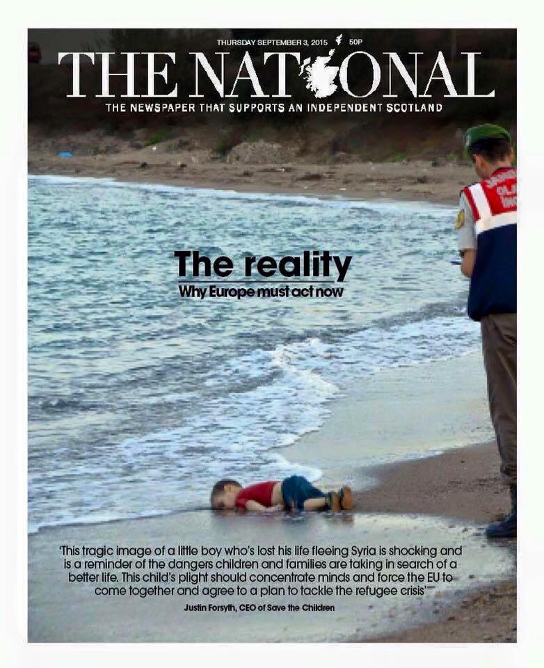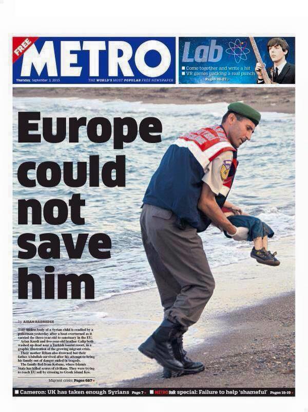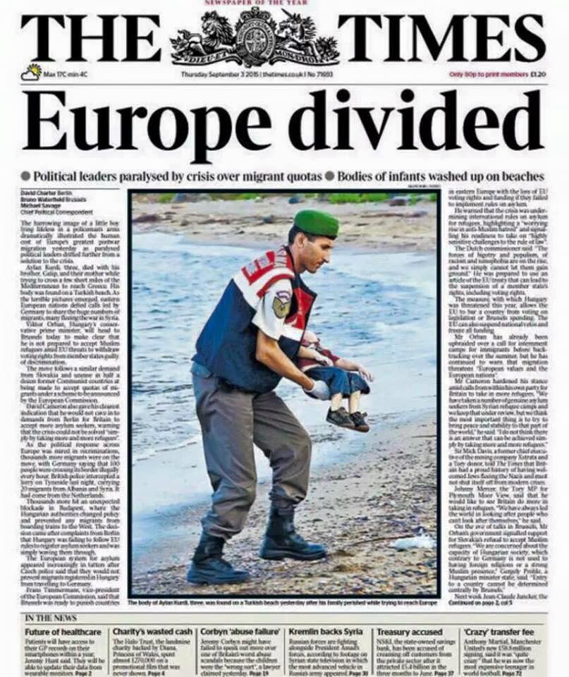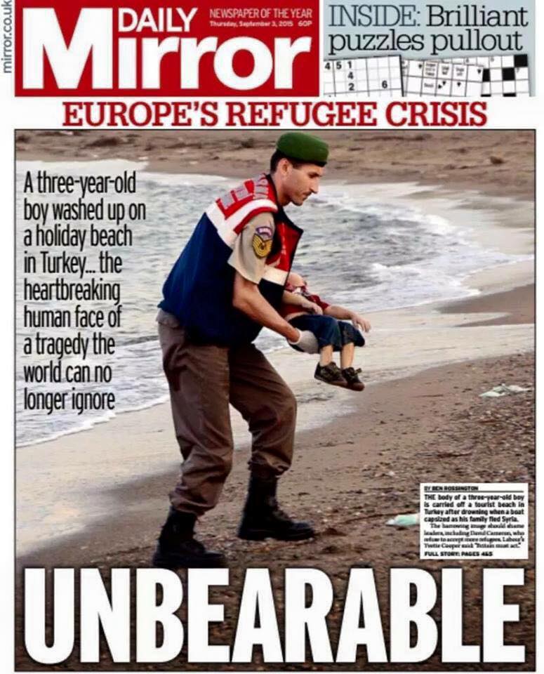 وتصدرت صورة صادمة لطفل سوري طريح على شاطئ تركي، بعدما غرق قارب كان يحمله مع آخرين تجاه الشواطئ الأوروبية، الصفحة الأولى لصحيفة “الإندبندنت”، بينما آثرت عدة صحف أخرى نشر صورة لنفس الطفل محمولًا -دون أن يظهر وجهه- بين يدي أحد أفراد الشرطة التركية.