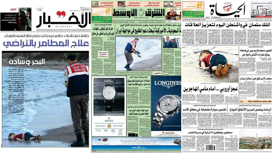 وعلى مستوى الصحف العربية، اهتمت كل من صحيفة “الحياة” اللندنية، والشرق الأوسط السعودية، وصحيفة الأخبار اللبنانية، بالطفل الغريق وتصدرت صورة الطفل وهو ملقى على أحد شواطئ تركيا الصحف العربية الثلاثة.