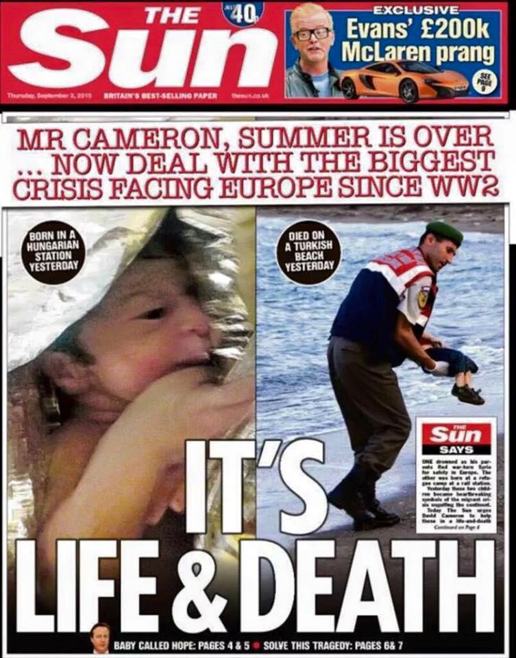 وأبرزت صحيفة “الصن” مأساة الطفل السوري الغارق، بنشر صورة له وبجانبها صورة للطفلة “شمس” التي ولدت لأرملة سورية داخل محطة قطارات في المجر.