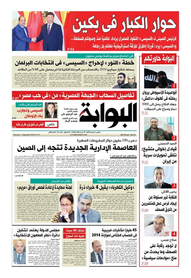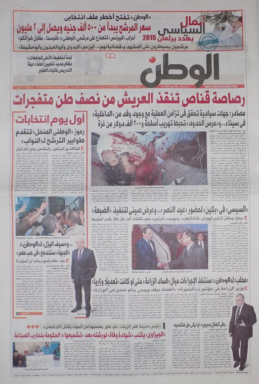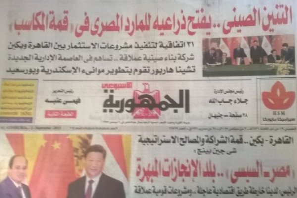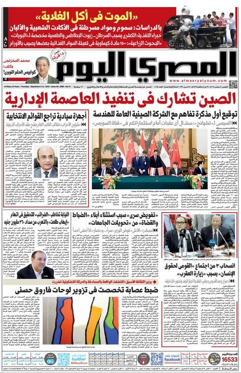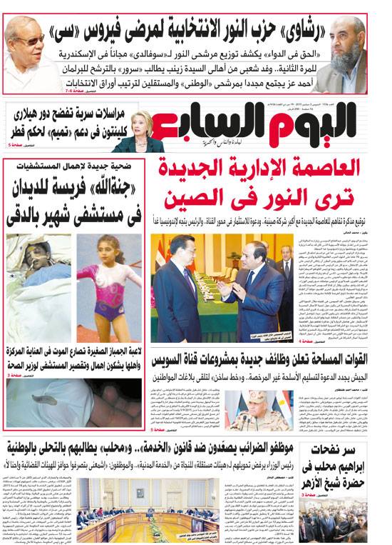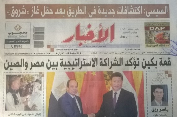 واهتمت الصحف المصرية بزيارة السيسي للصين، ومدي نجاح الزيارة وأبرز الاتفاقيات التي وقعها السيسي في الصين، كما اهتمت بفتح باب الترشح للانتخابات البرلمانية، وكثافة الحضور للمتقديمن، وأبز المرشحين.