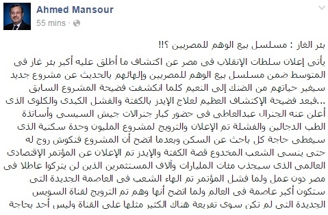 رأى الإعلامي أحمد منصور، مقدم البرامج الفضائية بـ”الجزيرة”، أن ما أعلنته الحكومة المصرية بشأن اكتشاف أكبر حقل غاز هو مسلسل بيع الوهم للمصريين.