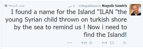 وقال ساويرس -في تغريده على صفحته الرسمية بموقع التدوينات القصيرة “تويتر”، اليوم السبت-: “لقد وجدت اسمًا للجزيرة.. “إيلان” الطفل السوري الغارق على شواطئ تركيا، حتى تذكرنا به دائمًا.. والآن أنا محتاج أن أجد الجزيرة”.