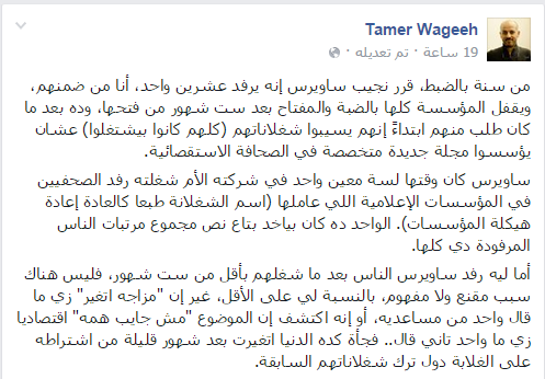 وأردف: منذ عام  “قرر نجيب ساويرس إنه يرفد عشرين واحد، أنا من ضمنهم، ويقفل المؤسسة كلها بالضبة والمفتاح بعد ست شهور من فتحها، وده بعد ما كان طلب منهم ابتداءً إنهم يسيبوا شغلاناتهم (كلهم كانوا بيشتغلوا) عشان يؤسسوا مجلة جديدة متخصصة في الصحافة الاستقصائية..ساويرس كان وقتها لسة معين واحد في شركته الأم شغلته رفد الصحفيين في المؤسسات الإعلامية اللي عاملها (اسم الشغلانة طبعا كالعادة إعادة هيكلة المؤسسات)، الواحد ده كان بياخد بتاع نص مجموع مرتبات الناس المرفودة دي كلها”.