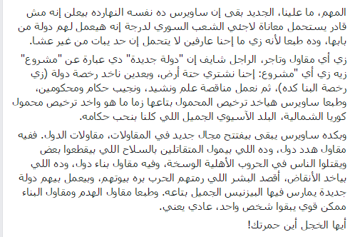 وأضاف “وجيه”: “زي أي مقاول وتاجر، الراجل شايف إن “دولة جديدة” دي عبارة عن “مشروع” زيه زي أي “مشروع: إحنا نشتري حتة أرض، وبعدين ناخد رخصة دولة (زي رخصة البنا كده)، ثم نعمل مناقصة علم ونشيد، ونجيب حكام ومحكومين، وطبعا ساويرس هياخد ترخيص المحمول بتاعها زما ما هو واخد ترخيص محمول كوريا الشمالية، البلد الآسيوي الجميل اللي كلنا بنحب حكامه”.
