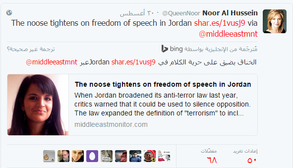 كما نشرت الملكة التي يتابعها على “تويتر” ما يقرب من نصف مليون شخص، رابطًا لتقرير ينتقد حرية التعبير ويتهم الملك عبد الله الثاني بتبني خطاب متناقض حول الحريات، بعد إصدار قانون “مكافحة الإرهاب” الذي أعطى السلطات مجالاً لاحتجاز الصحفيين.