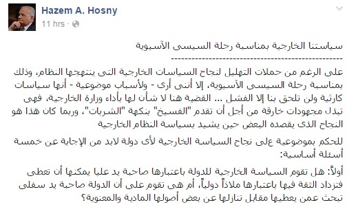 وكتب حسني، في منشور عبر صفحته الرسمية على موقع “فيس بوك”: “على الرغم من حملات التهليل لنجاح السياسات الخارجية التي ينتهجها النظام، وذلك بمناسبة رحلة السيسي الآسيوية، فإنني أرى -ولأسباب موضوعية- أنها سياسات كارثية ولن تلحق بنا إلا الفشل، القضية هنا لا شأن لها بأداء وزارة الخارجية، فهي تبذل مجهودات خارقة من أجل أن تقدم “الفسيخ” بنكهة “الشربات”، وربما كان هذا هو النجاح الذي يقصده البعض حين يشيد بسياسة النظام الخارجية”.