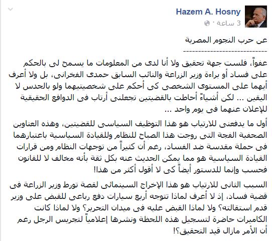 وقال -عبر منشور له على “فيس بوك”-: “عفوًا، فلست جهة تحقيق ولا أنا لديَّ من المعلومات ما يسمح لي بالحكم على فساد أو براءة وزير الزراعة والنائب السابق حمدي الفخراني، بل ولا أعرف أيهما على المستوى الشخصي كي أحكم على شخصيتيهما ولو بالحدس لا اليقين، لكن أشياءً أحاطت بالقضيتين تجعلني أرتاب في الدوافع الحقيقية للإعلان عنهما في يوم واحد”.