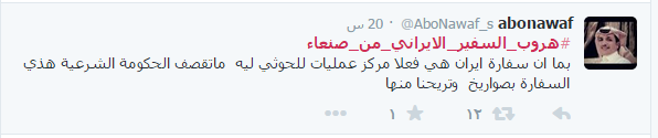 فقال أبو نواف: “بما إن سفارة إيران هي فعلاً مركز عمليات للحوثي ليه ما تقصف الحكومة الشرعية هذي السفارة بصواريخ وتريحنا منها؟”.