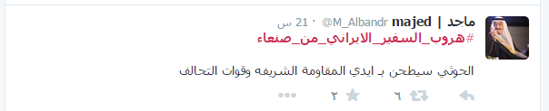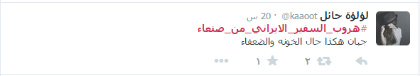 وإثر ذلك برز هاشتاج على موقع التواصل الاجتماعي “تويتر” حمل إسم #هروب_السفير_الإيراني_من_صنعاء ، وجاءت فيه العديد من التعليقات من المغردين العرب حيال الأمر.