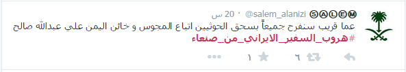 وعلق سالم مغردًا ” عما قريب سنفرح جميعًا بسحق الحوثيين أتباع المجوس و خائن اليمن علي عبدالله صالح”.