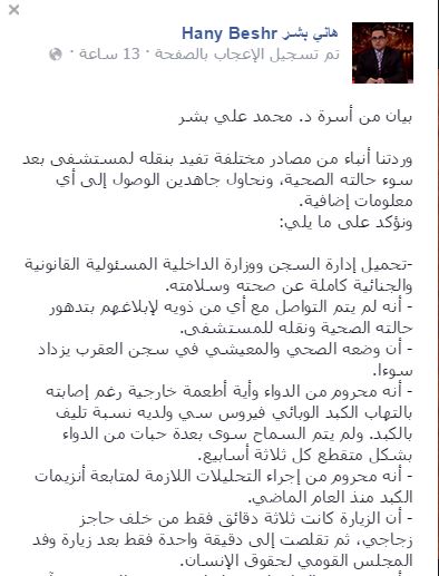 وحمَّلت أسرته -في بيان لها نشره نجله عبر صفحته بموقع التواصل الاجتماعي، فيس بوك- إدارة السجن ووزارة الداخلية المسؤولية القانونية والجنائية كاملةً عن صحة وسلامة “بشر”، مشيرة إلى أنه لم يتم التواصل مع أيٍّ من ذويه لإبلاغهم بتدهور حالته الصحية ونقله للمستشفى.