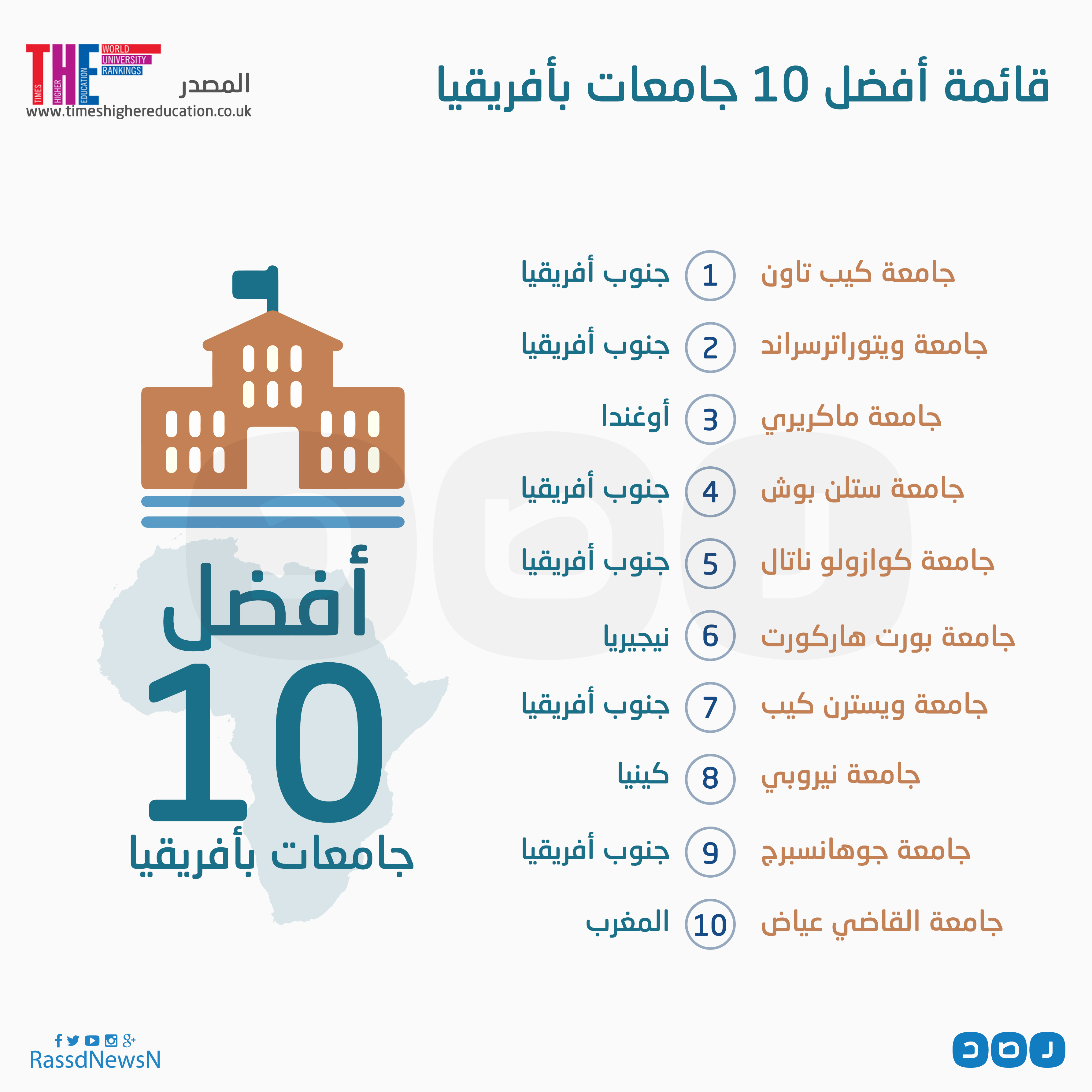 جاء ذلك بحسب قائمة نشرتها مجلة “التايمز” للتعليم العالي البريطانية، وبحسب القائمة يتضح أن جنوب إفريقيا تصدرت بـ8 جامعات.