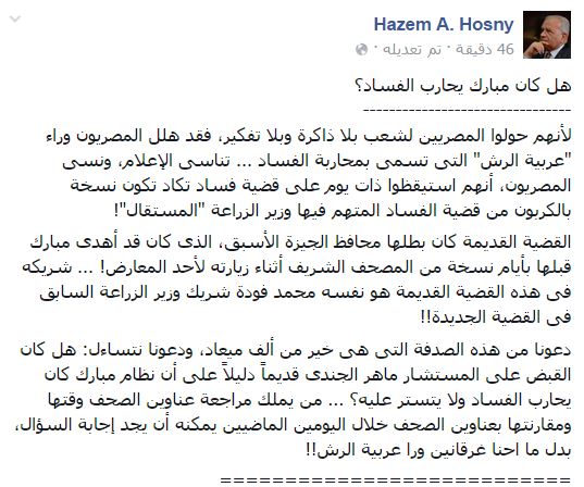 وقال حسني -عبر منشور له على “فيس بوك”-: “لأنهم حولوا المصريين لشعب بلا ذاكرة وبلا تفكير، فقد هلل المصريون وراء “عربية الرش” التى تسمى بمحاربة الفساد.. تناسى الإعلام، ونسي المصريون أنهم استيقظوا ذات يوم على قضية فساد تكاد تكون نسخة بالكربون من قضية الفساد المتهم فيها وزير الزراعة “المستقال“!.