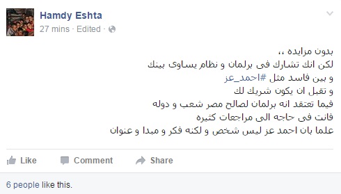 وأشار حمدي قشطة إلى أن أحمد عز ليس شخص و لكنه فكر و مبدأ و عنوان لمرحلة