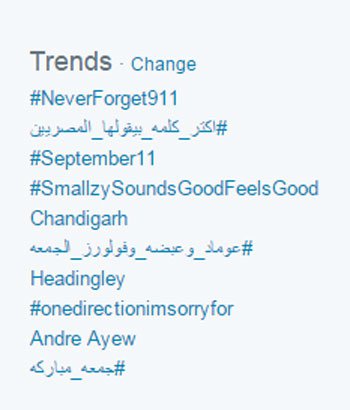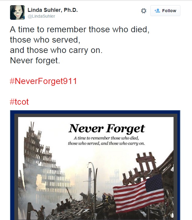وعلى موقع التواصل الاجتماعي “تويتر”، تم تدشين عدة هاشتاجات من أهمها #NeverForget911 الذي أبدى غالبية رواده تعاطفهم ومواساتهم لأهالي الضحايا؛ حيث قالت د. ليندا تشولر “في هذا الوقت علينا أن نتذكر جميع من ماتوا، أولئك الذين خدمونا، لن ننساكم أبدا”.