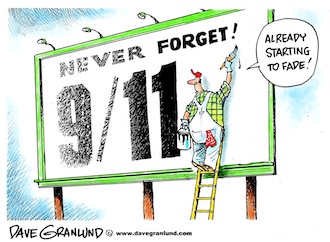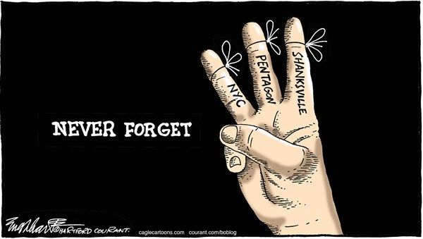 ولم تغب ذكرى أحداث 11 سبتمبر عن رسامو الكاريكاتير بأغلب الصحف العربية والعالمية؛ إذ نشرت صحيفة نيوز أدفانز كاريكاتير تحت عنوان “Never Forget“