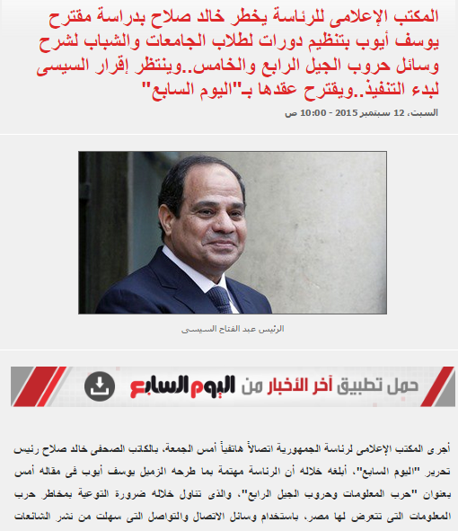 من أجل أن يجود المكتب الإعلامى لرئاسة الجمهورية – المشغولة بمواجهة حروب الجيل الرابع – عمله، عرضوا على السيسى المقترح الوارد فى المقال بتنظيم دورات تدريبية مكثفة لطلاب الجامعات والشباب، لشرح أساليب ووسائل حروب الجيل الرابع والخامس، مع توصية بالبدء فوراً فى عقد هذه الندوات داخل مقر جريدة “اليوم السابع” بعد موافقة السيسى على الفكرة.