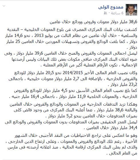 وأفاد “الولي” أن نصيب العام المالي الأخير 2014-2015 كان نحو 20.5 مليار دولار للودائع والقروض الخارجية، بالإضافة إلى 2.7 مليار دولار معونات خليجية، بإجمالي 23.2 مليار دولار.