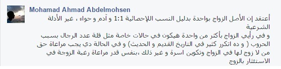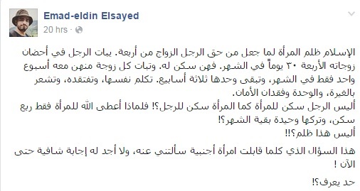 وبدأ الجدل حينما نشر المدون والمصور، عماد الدين السيد، منشورًا عبر صفحته الرسمية “فيس بوك” قال فيه: “الإسلام ظلم المرأة لما جعل من حق الرجل الزواج من أربع، يبات الرجل في أحضان زوجاته الأربعة ٣٠ يوما في الشهر، فهن سكن له، وتبات كل زوجة منهن معه أسبوع واحد فقط في الشهر، وتبقى وحدها ثلاثة أسابيع، تكلم نفسها، وتفتقده، وتشعر بالغيرة والوحدة وفقدان الأمان”.