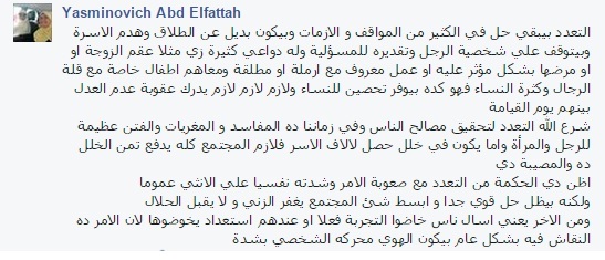 بينما قالت ياسمين عبد الفتاح معلقة على المنشوره بقولها: “شرع الله التعدد لتحقيق مصالح الناس، وفي زماننا ده المفاسد والمغريات والفتن عظيمة للرجل والمرأة، وإما يكون في خلل حصل لآلاف الأسر فلازم المجتمع كله يدفع تمن الخلل ده والمصيبة دي، وأظن دي الحكمة من التعدد مع صعوبة الأمر وشدته نفسيا على الأنثى عموما، لكنه بيظل حلا قويا جدا وأبسط شيء المجتمع يغفر الزنا ولا يقبل الحلال”.