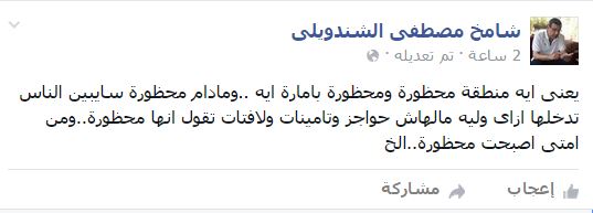 وقال -عبر منشور له على “فيس بوك”-: “يعني إيه منطقة محظورة ومحظورة بأمارة إيه.. وما دامت محظورة سايبين الناس تدخلها ازاي وليه؟ مالهاش حواجز وتأمينات ولافتات تقول إنها محظورة؟.. ومن إمتى أصبحت محظورة؟”.
