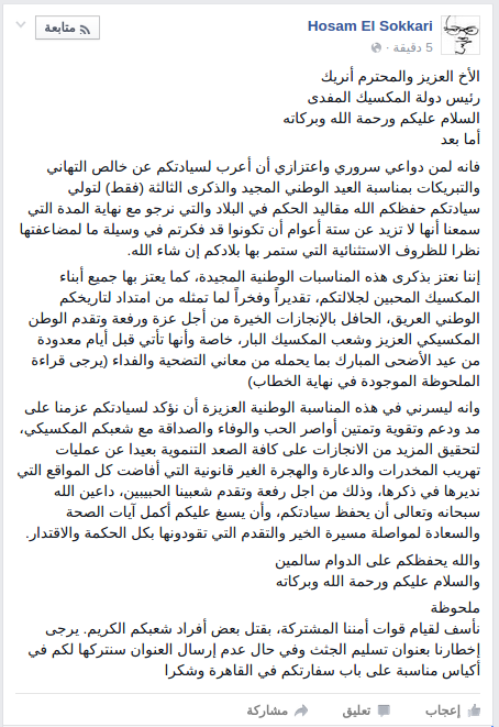 وكتب “السكري” في رسالته الساخرة: “الصديق العزيز أنريك.. رئيس دولة المكسيك المفدى.. السلام عليكم ورحمة الله وبركاته.. أما بعد، فإنه لمن دواعي سروري واعتزازي أن أعرب لسيادتكم عن خالص التهاني والتبريكات بمناسبة العيد الوطني المجيد والذكرى الثالثة (فقط) لتولي سيادتكم حفظكم الله مقاليد الحكم في البلاد والتي نرجو مع نهاية المدة التي سمعنا أنها لا تزيد على ستة أعوام أن تكونوا قد فكرتم في وسيلة ما لمضاعفتها نظرا للظروف الاستثنائية التي ستمر بها بلادكم إن شاء الله”.