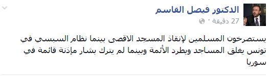 وتابع -في منشور آخر-: “يستصرخون المسلمين لإنقاذ المسجد الأقصى، بينما نظام السبسي في تونس يغلق المساجد ويطرد الأئمة، وبينما لم يترك بشار مئذنة قائمة في سوريا”.