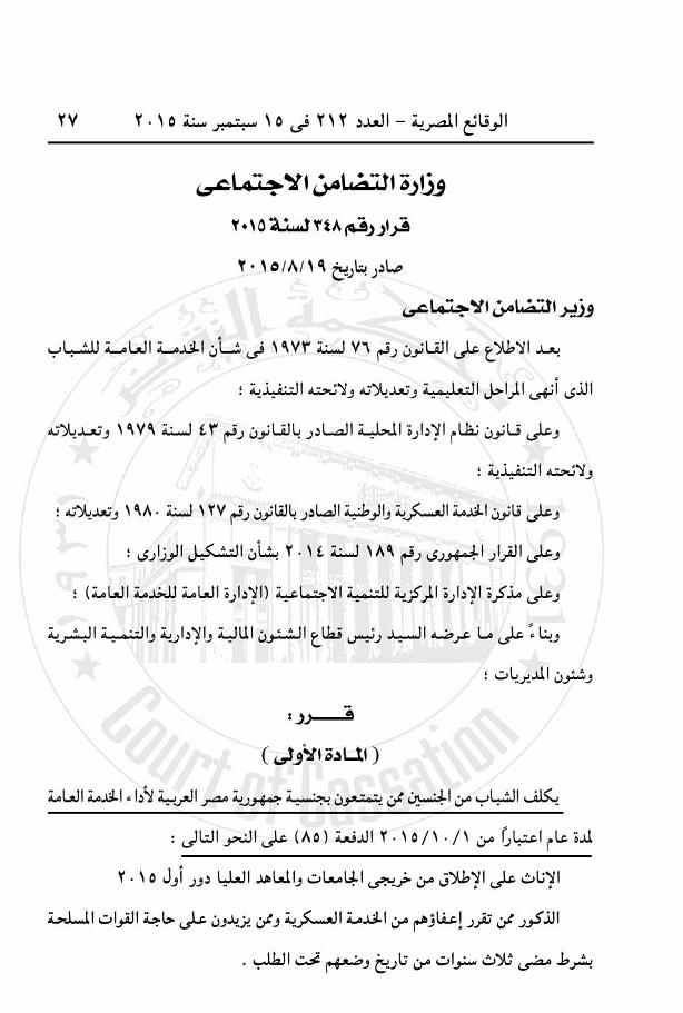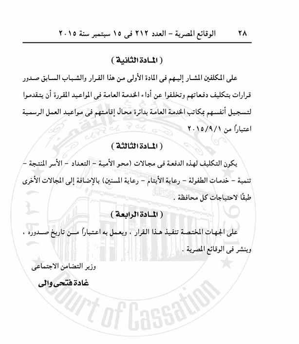 نشرت الجريدة الرسمية، في عددها الصادر اليوم الثلاثاء، قرار وزارة التضامن الاجتماعي، رقم 348 لسنة 2015، بتكليف الشباب من الجنسين لأداء الخدمة العامة لمدة عام اعتباراً من 1 أكتوبر المقبل، على النحر التالي: ”الإناث على الإطلاق من خريجي الجامعات والمعاهد العليا دول أول 2015، والذكور ممن تقرر إعفاؤهم من الخدمة العسكرية وممن يزيدون على حاجة القوات المسلحة بشرط مضي 3 سنوات من تاريخ وضعهم تحت الطلب”.