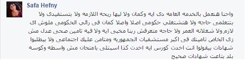 قالت صفاء حفني: “وإحنا هنعمل بالخدمة العامة دي إيه وكمان ولا ليها ريحة اللازمة ولا بتستفيدي ولا بتتعلمي حاجة ولا هتشتغلي حكومي أصلا، وأصلا كمان في رأي الحكومة مالوش أي لزمة ولا شغلانة العمر ولا حاجة ماتعرفش ربنا مخبي إيه ولا فيه تأمين صحي عدل مش زي الخاص تأمينك في أكبر مستشفيات الجمهورية ومتأمن عليك اجتماعي ولا بيطلبوا شهادات بيقولوا إنت أخدت كورس إيه أخدت كذا، بلد بتاعت شهادات صحيح”.