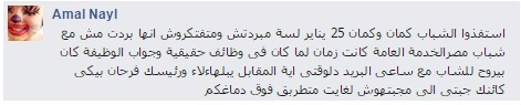 كما انتقدت أمل نايل القرار قائلة: “استفذوا الشباب كمان وكمان 25 يناير لسه مابردتش وماتفتكروش إنها بردت مش مع شباب مصر الخدمة العامة كانت زمان لما كان في وظائف حقيقية وجواب الوظيفة كان بيروح للشاب مع ساعى البريد دلوقتى اية المقابل يبلهاءلاء ورئيسك فرحان بيكي كأنك جبتي اللي ماجبتهوش لغايت ماتطربق فوق دماغكم”.