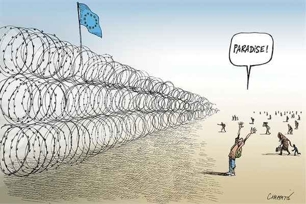 وسلطت الرسومات الضوء على الأزمة المتفاقمة لنزوح اللاجئين السوريين إلى أوروبا، فاختارت صحيفة “دومينيون بوست” أن تشير إلى دول الاتحاد الأوروبي على أنها “الجنة” بالنسبة للمهاجرين.