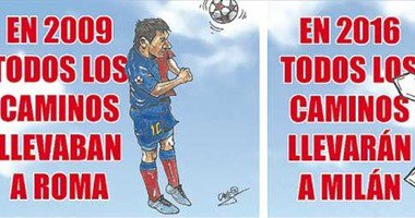 ورياضيا، نشرت صحيفة “سبورت” الكتالونية، كاريكاتيرا عن مواجهة برشلونة وروما بصورة البرغوث ليونيل ميسى بعنوان: “في عام 2009.. كل الطرق تؤدي إلى روما، في عام 2016.. كل الطرق تؤدي إلى ميلان”، في إشارة منها لرغبة البارسا في الحفاظ على لقب “تشامبيونزليج”، بداية من روما للوصول لنهائي البطولة الذي سيقام على ملعب “سان سيرو” في مدينة ميلانو.