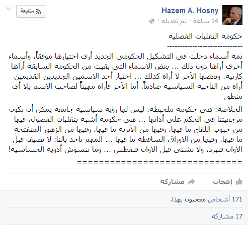 قال حازم حسنى أستاذ العلوم السياسية بجامعة القاهره : ثمة أسماء دخلت فى التشكيل الحكومى الجديد أرى اختيارها موفقاً، وأسماء أخرى أراها دون ذلك
