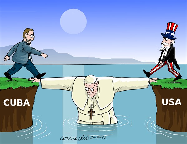 واهتمت صحيفة “التايمز” البريطانية بدور البابا فرانسيس في التقريب بين سياسة كوبا والولايات المتحدة الأميركية خلال زيارته الأخيرة لكوبا، فكان لها هذا الرسم: