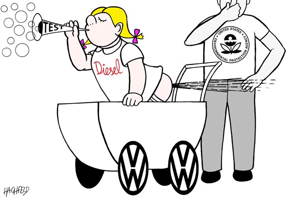 وجه عديد من الصحف العالمية أسهم رساميها نحو الفضيحة التي هزت الشركة العالمية “فولكس فاجن”، بعد أن أقرت بالغش في اختبارات انبعاثات السيارات التي تعمل بالديزل في الولايات المتحدة، حيث قالت كوريا الجنوبية إنها ستجري تحقيقا، في حين دعا وزير فرنسي إلى تحقيق على مستوى الاتحاد الأوروبي، ولعل أشهر الكاريكاتيرات ذلك الذي نشرته صحيفة “واشنطن بوست” للرسام الألماني راينر هاتفيلد: