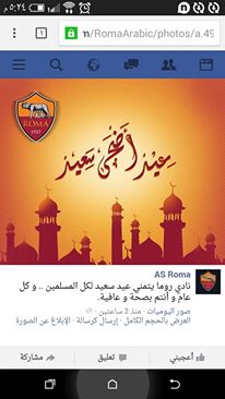 هنأ نادي روما الإيطالي المسلمين بحلول عيد الأضحى المبارك، وذلك عبر صفحته الرسمية على موقع التواصل الاجتماعي "فيس بوك"، حيث تمنى عيدا سعيدا للمسلمين في أنحاء العالم