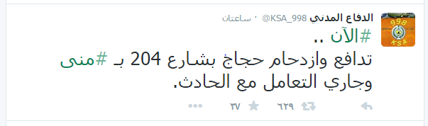 وقال الدفاع المدني -على موقع التواصل الاجتماعي “تويتر”- إنه يجري حاليًا التعامل مع الحادث، فيما أقامت الفرق الصحية التابعة له منطقتين للفرز الطبي، فيما يواصل مئات الآلاف من حجاج بيت الله الحرام رمي جمرة العقبة في أول أيام عيد الأضحى.