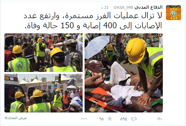 أعلن الدفاع المدني السعودي، اليوم الخميس، عن وفاة 100 حاج على الأقل، وإصابة 400 آخرين، وذلك جرَّاء تدافع وازدحام حجاج بشارع 204 في “منى”.