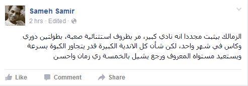 ونشر الكاتب الساخر سامح سمير في هزيمة الزمالك بعد فوزه ببطولتين منشور على صفحته، قائلا: أن الزمالك سيتخطى أزمة نجاحه وسيعود لمستواه من الخسارة”.