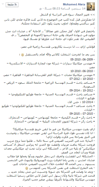 يقول محمد عطية، خلال صفحته على موقع التواصل الاجتماعي “فيسبوك” عن مشواره التعليمي وقصة نجاحه: العديد يسألونني هل يمكن لأحد أن يغير مجال عمله؟.. “نعم” فمهنة الإنسان لا تكون مكتوبة في شهادة ميلاده وبالتالي يمكن تغييرها، مضيفًا أنه كان مهندسًا زراعيًا ثم استطاع أن يعلم نفسه تخصصات أخرى ليغير مجال عمله.