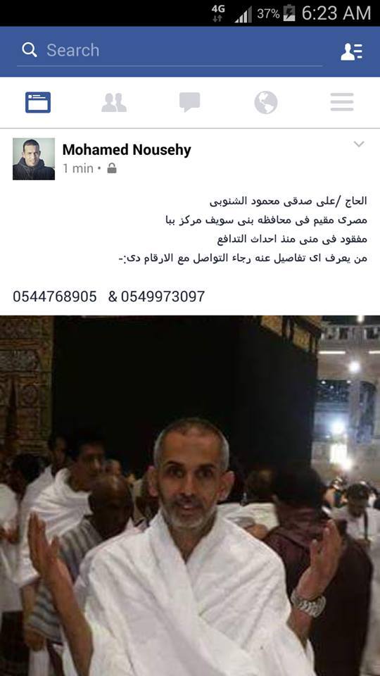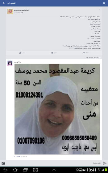 أعلنت الجالية المصرية بالمملكة العربية السعودية، عبر صفحتها الرسمية على “فيس بوك”، عن أسماء مدعومة بصور وبيانات لمفقودين أثناء أداء الحج في حادث التزاحم بمنى.